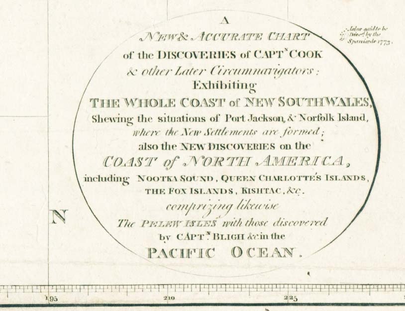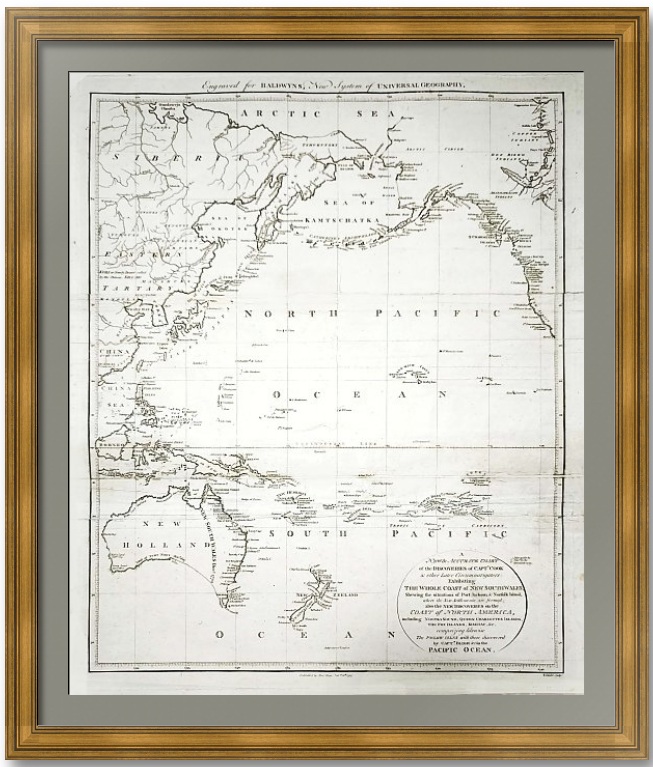 На карте изображен Тихий океан с частью Азии, Юго-Восточной Азии, Японии, Австралии, Новой Зеландии и Северной Америки. Эта карта основана на открытиях капитана Кука и других более поздних мореплавателей, совершивших кругосветное путешествие в XVIII веке.