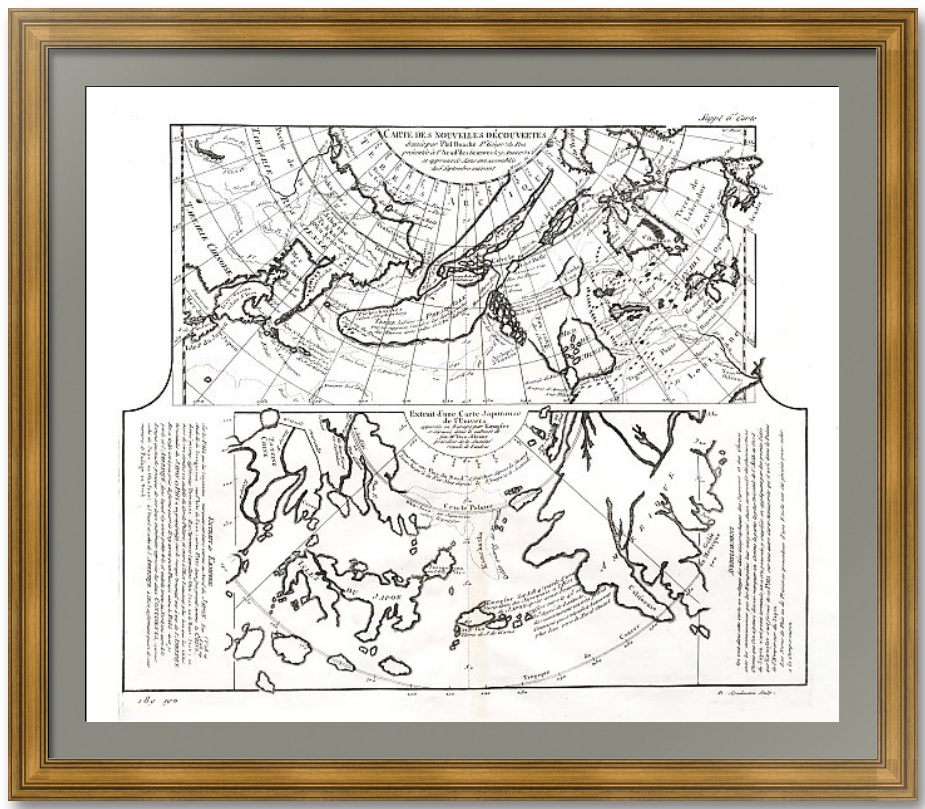 На верхней карте изображена восточная окраина Сибири, Китай, полуостров Камчатка, северная оконечность Японии, Аляска как «Пухочоцкие» (Puchochotskes) и северо-западная часть Северной Америки, простирающаяся от Канады до Нового Орлеана на юге Луизианы и Лабрадора на северо-востоке. Показаны маршруты исследования, проведенного русскими мореплавателями в 1741 году под командованием капитана Витуса Беринга и Алексея Чирикова. Следует отметить, что Аляска сильно искажена, как и размеры многих водоемов на севере Северной Америки. Мифическое «Западное море» (Mer de l’Ouest) изображено здесь с двумя входами: один, предположительно, был открыт Хуаном де Фука (Juan de Fuca), а другой — Мартином д’Агиларом (Martin d’Aguilar). На карте Квивира (Quivira) и Тегуайо (Teguiaio) изображены к югу и востоку от Западного моря. Река Миссисипи показана текущей на юг мимо Нового Орлеана. Большое озеро под названием «Лак-де-Валаско» (Lac de Valasco) изображено к северу и востоку от Аляски. Включен остров в северной части Тихого океана под названием «Киа-и-тао» (Kia-y-tao) с описанием: «Киа-и-тао китайцев и японцев, которые утверждают, что это земля Дж. де Гамы» (Kia-y-tao des Chinois et des Japannois qu l’on pretend etre la Terre de J. De Gama). Также включен «Иесо» (Ieso) или «Остров Иесо» (Isle d’Ieso) к северу от Ниппона.