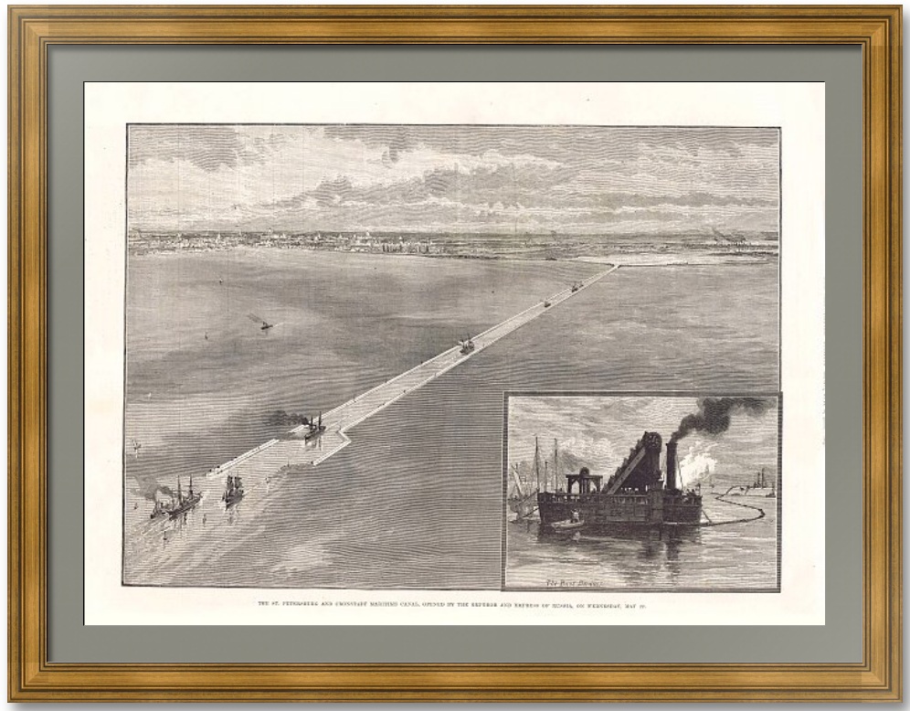 Фантазийный вид Морского канала Петербурга на старинной оригинальной гравюре. В право нижнем углу изображение земснаряда (землечерпалки) в действии. Хорошее коллекционное состояние, оттиск яркий и четкий. Бумага имеет лёгкий кремовый оттенок. Verso text.