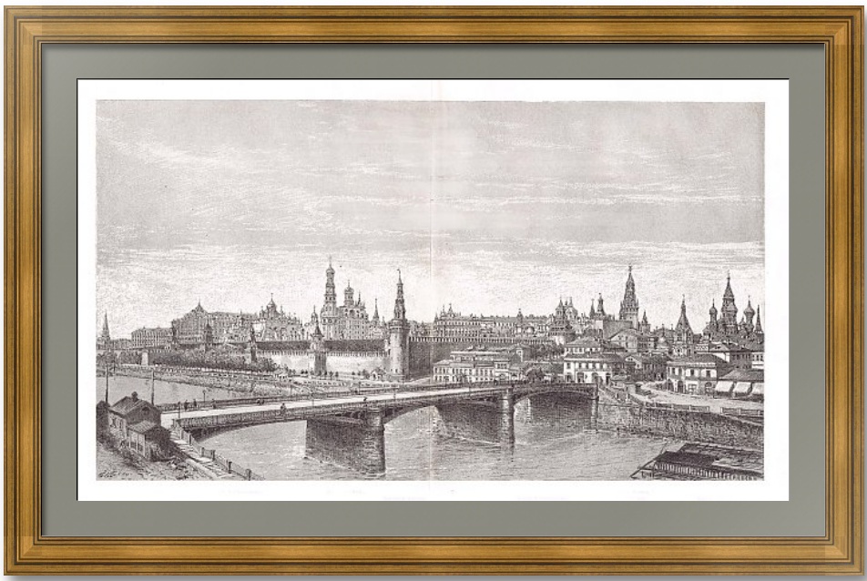 Общий вид Московского Кремля. Рисунок Юбера Клерже по фотографии, предоставленной г-ном Х. Тауне. Прототип (фотография) находится в собрании Государственного Исторического Музея (Фотобумага, картон, альбуминовый отпечаток; номер ГИМ 70156/17522). На гравюре показаны узнаваемые достопримечательности архитектурного ансамбля: Кремлевская стена с башнями (Спасская, Москворецкая, Благовещенская, Первая безымянная, Тайницкая, Вторая безымянная), Сенат, Благовещенский собор, Архангельский собор, Успенский собор, Колокольня Ивана Великого и Успенская звонница, Храм Василия Блаженного.