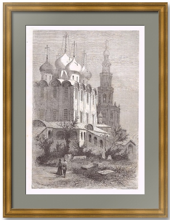 Вид на Смоленский собор Новодевичьего монастыря. Гравюра в хорошем состоянии. Представляет художественную и историческую ценность.