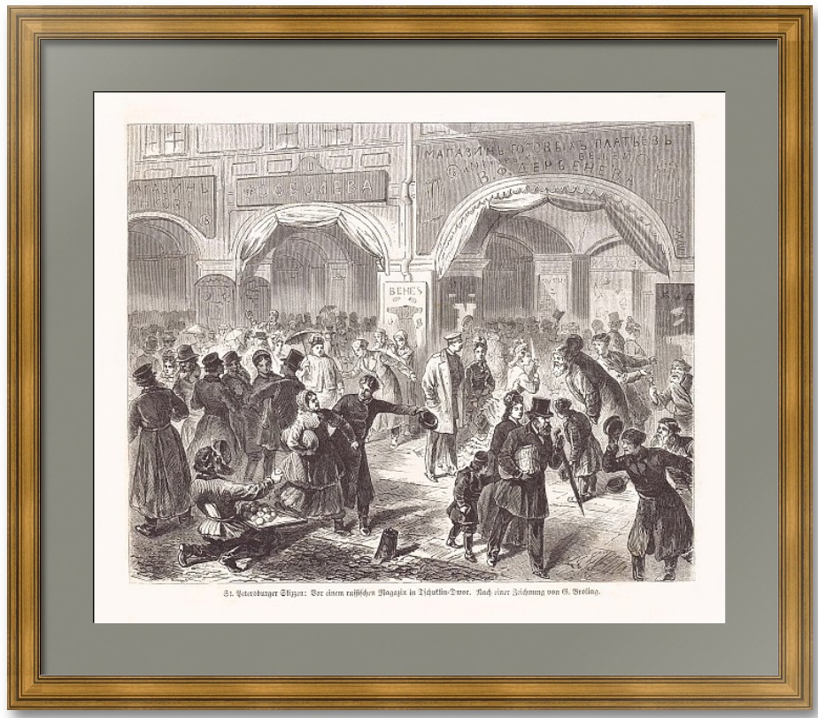 Петербургские зарисовки: Перед русским магазином в (Ли) Щукином дворе. По рисунку Г. Бролинга.