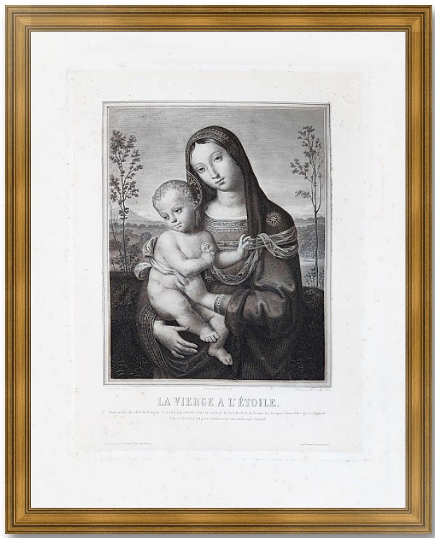 Надписи: La Vierge à l’Étoile. Tableau du Musée Royal. Pinturicchio pinx. J.M. Leroux del & sculp. 1840. Pinturicchio fut élève du Pérugin. … (Мадонна со звездой. Картина из Королевского музея. Pinturicchio pinx. J.M. Leroux del & sculpture. 1840. Пинтуриккио был учеником Перуджино. …)